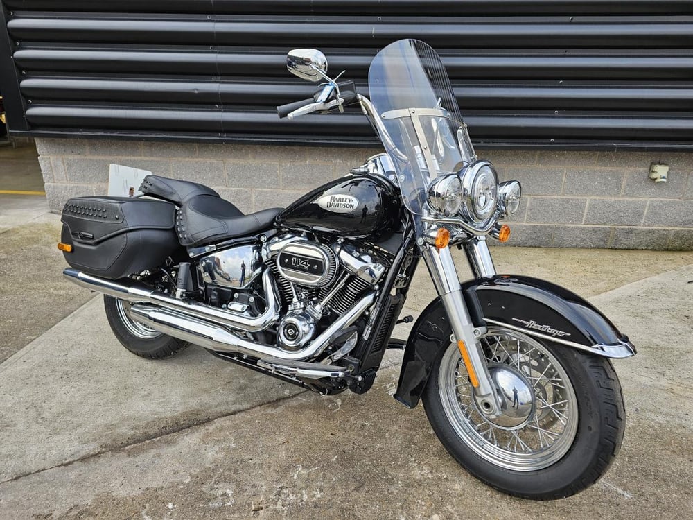 This stunning Heritage Classic 114 features classic laced wheels and a striking Vivid Black finish with chrome trim.